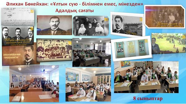 14 қыркүйек күні сынып жетекшілердің ұйымдастыруымен 8-9 сынып оқушыларымен "Әлихан Бөкейханов: Ұлтқа қызмет ету білімнен емес, мінезден" тақырыбымен адалдық сағатын өткізді. Мақсаты :Ұлт көсемі Ә.Бөкейхановтың өмірі мен қызметін насихаттай отырып, жас ұрпақты адал қызмет етуге, елінің патриоты болуға баулу.