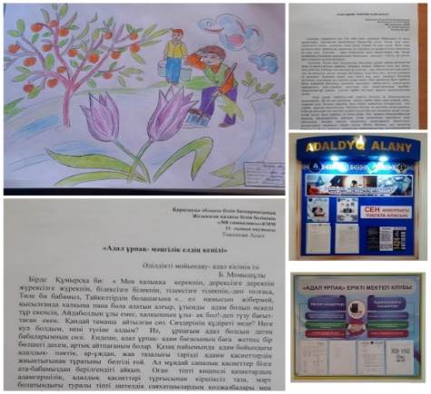 Сыбайлас жемқорлыққа қарсы іс- қимыл жоспарына сәйкес өскелең ұрпақты сыбайлас жемқорлыққа қарсы мәдениетті қалыптастыру мәселелері бойынша мектепішілік жоспарды жүзеге асыру шеңберінде сыбайлас жемқорлыққа қарсы сауаттандыру және қоғаммен ынтымақтастық бойынша, оқушылар арасында сыбайлас жемқорлыққа қарсы мәдениет деңгейін және оның кез-келген түріне мүлдем төзбеушілікті қалыптастыруға, құқықтық сауаттылықты арттыруға, жастарды қазақстандық патриотизм рухында тәрбиелеу мақсатында «Адал ұрпақ» ерікті мектеп клубы мен 1-11 сынып оқушыларының қатысуымен іс-шаралар өткізілді. Оқушылар "АДАЛДЫҚ”, «ЖЕМҚОРЛЫҚ» деген сөздің мағынасын , сурет салу, эссе жазу, арқылы жеткізді.