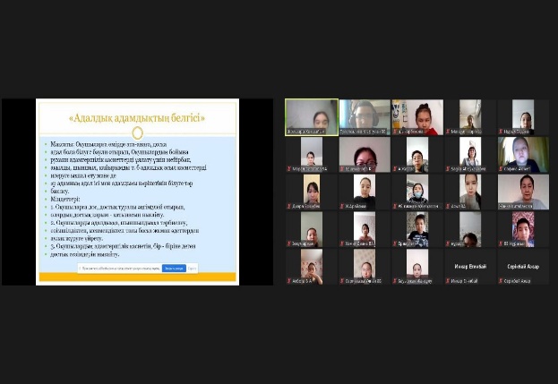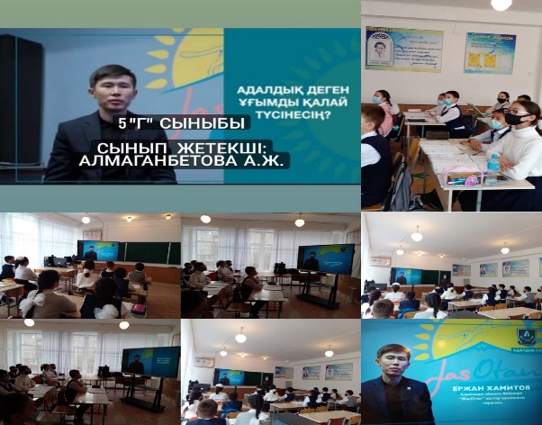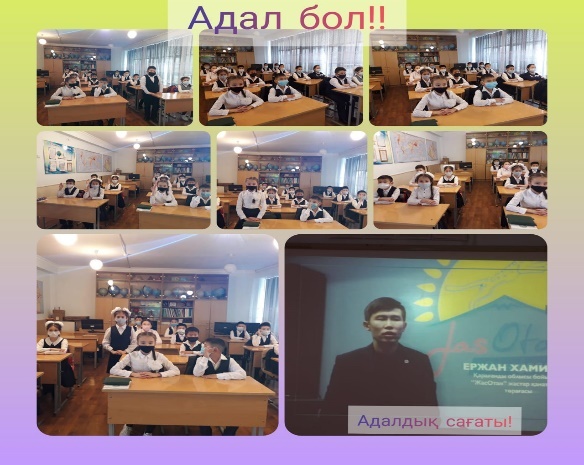 24 қараша күні өскелең жас ұрпақтың өн бойына адалдық, парасаттылық, әділдік, сенім құндылықтарын сіңіруге және жас буынның рухани болмысын бекітіп, сыбайлас жемқорлыққа қарсы мәдениетін қалыптастыру мақсатында 5-8 сыныптарға Қарағанды облысы "Жас Отан" жастар қанатының төрағасы Ержан Хамитовпен қашықтықтан АДАЛДЫҚ САҒАТЫ өткізілді.Іс-шараға 187 оқушы қатысты.