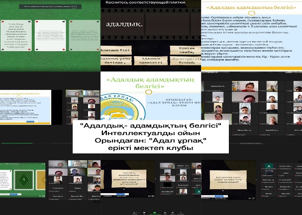 21.01.2022ж Адал ұрпақ» ерікті мектеп клубының ұйымдастыруымен "Адалдық адамдықтың белгісі" тақырыбында 8-9 сынып оқушыларымен интеллектуалды ойын өткізілді. Мақсаты: сыбайлас жемқорлыққа қарсы іс- қимыл жоспарына сәйкес өскелең ұрпақты сыбайлас жемқорлыққа қарсы мәдениетті қалыптастыру мәселелері бойынша мектепішілік жоспарды жүзеге асыру шеңберінде оқушыларға өмірде ата-анаға, досқа адал бола білуге баули отырып,олардың бойына рухани адамгершілік қасиеттерді ұялату үшін мейірбан,ақылды, шыншыл, қайырымды , адамдық асыл қасиеттерді игеруге ықпал ету және әр адамның адал ісі мен адамдығы көрінетінін білуге тәрбиелеу.